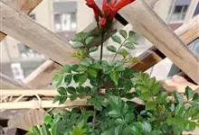 凌霄 Schum.),别名上树龙、五爪龙、九龙下海等,为紫葳科凌霄属的攀援藤本植物。其茎木质,以气生根攀附于它物之上。叶对生,为奇数羽状复叶;小叶卵形至卵状披针形,边缘有粗锯齿;顶生疏散的短圆锥花序,…全部>>