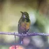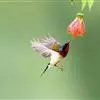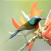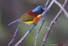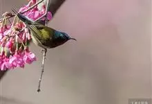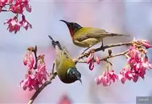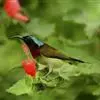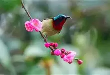 绿喉太阳鸟:共有9个亚种。小型鸟类,雄鸟体长13-15厘米、雌鸟10-12厘米。雄鸟前额至后颈、颏和喉辉绿色,头侧黑色,颈侧和背暗红色,两肩、下背橄榄绿色,腰鲜黄色,尾上覆羽和中央尾羽暗绿色,…全部>>