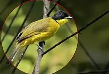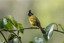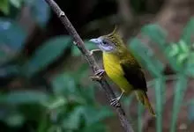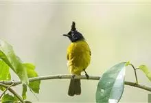 黑冠黄鹎:体长18-21厘米,是一种中等体型偏黄色鹎。整个头、颈、颏、喉黑色,头顶有显著直立的羽冠,黑色,上体褐橄榄黄绿色,下体橄榄黄色。虹膜偏红;嘴及脚黑色。…全部>>