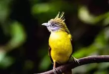 黄腹冠鹎:体长19-24厘米,是一种体型略大的褐色鹎。头顶橄榄褐色具黑褐色羽冠。白色的喉膨起,下体黄色。似白喉冠鹎但较鲜亮,上体褐色较重,腹部为鲜亮的柠檬黄色。虹膜褐色;嘴黑色;脚粉红色。…全部>>