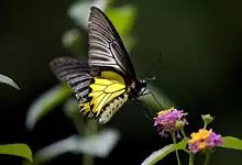金裳凤蝶是凤蝶科、裳凤蝶属的动物。金裳凤蝶身体呈黑色,头、颈和胸侧有红毛,腹部有黑黄两色相间条纹,雄蝶前翅黑色,具黑天鹅绒光泽,各脉两侧灰白色,后翅金黄色,各室外缘有等腰三角形黑斑1枚,斑内侧有晕,…全部>>