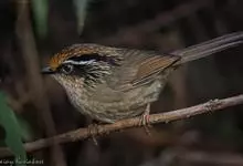 褐胁雀鹛,是莺科、雀鹛属的鸟类。褐胁雀鹛是小型鸟类,体长13-15厘米。头顶棕褐色,黑色侧冠纹和宽阔的白色眉纹,眼先黑色。上体包括两翅和尾橄榄褐色。颏、喉、胸、腹白色,腹和胸沾皮黄色,两胁橄榄褐色,…全部>>