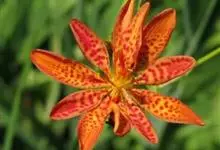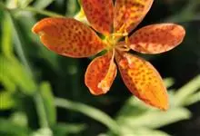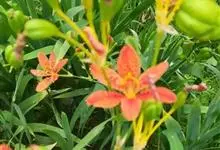 射干 Redouté)是鸢尾科射干属多年生草本植物。根状茎为不规则的块状,斜黄色或黄褐色;花橙红色,散生紫褐色的斑点;花药呈条形;子房下位,倒卵形;蒴果倒卵形或长椭圆形;种子圆球形,黑紫色,有光泽。…全部>>