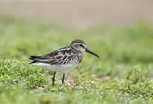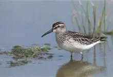 阔嘴鹬是涉禽,体长17厘米。特征为翼角常具明显的黑色块斑并具双眉纹。与黑腹滨鹬平滑下弯的嘴相比,阔嘴鹬的嘴具微小纽结,使其看似破裂。上体具灰褐色纵纹;下体白,胸具细纹;腰及尾的中心部位黑而两侧白。…全部>>
