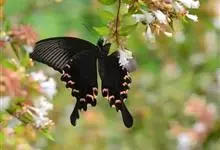 玉斑凤蝶Papilio helenus 别名白纹凤蝶,是凤蝶科凤蝶属美凤蝶亚属大型种类。雌雄同型;体翅皆黑色,后翅正面中室外有3个并列的白色斑,亚外缘有1列模糊的新月形红色斑,…全部>>