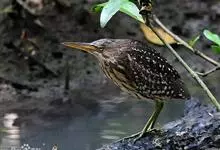 紫背苇鳽是鹭科、苇鳽属动物,为涉禽,体长约33厘米。头顶黑色,后头至尾上覆羽暗栗褐色;翅上覆羽橄榄黄色;下体浅棕黄色。多生活于水库和山脚边的稻田、芦苇丛、滩涂及沼泽草地,在西藏见于海拔2300米的农田,…全部>>