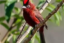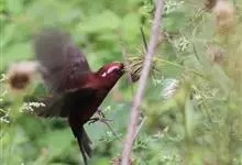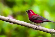 酒红朱雀小型鸟类,体长13~15厘米。雄鸟通体深红色,头部深朱红或棕红色,下背和腰玫瑰红色,眉纹粉红色而具丝绢光泽。两翅和尾黑褐或灰褐色、具暗红色狭缘,内侧两枚三级飞羽具淡粉红色先端。…全部>>