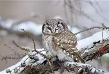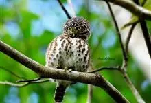 鬼鸮是鸟纲鸱鸮科的鸟类, 全长23-26厘米。共有6个亚种。雌雄羽色相同。额、头顶及枕部褐色,有白色椭圆斑。面盘白色外侧羽缘褐色。胸以下为白色,有褐色纵斑。翅褐色。…全部>>