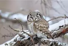 鬼鸮是鸟纲鸱鸮科的鸟类, 全长23-26厘米。共有6个亚种。雌雄羽色相同。额、头顶及枕部褐色,有白色椭圆斑。面盘白色外侧羽缘褐色。胸以下为白色,有褐色纵斑。翅褐色。…全部>>