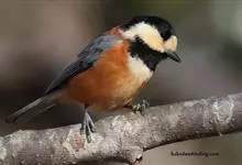 杂色山雀,是山雀科山雀属的一种动物。体重17-18克,体长125-140毫米。雌雄羽色相似。额、眼先、耳羽至颈侧乳黄色,头顶至后颈黑色,后头中央有一白斑。上背栗色,上体余部及翼蓝灰色。颏、喉黑色,…全部>>