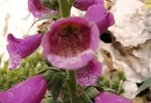 毛地黄是车前科、毛地黄属一年生或多年生草本植物。株高0.5—1米,茎直立,少分枝,全株被灰白色短柔毛和腺毛叶基生,呈莲座状,卵圆形或卵状披针形。顶生总状花序,花冠钟状,紫红色,内面有浅白斑点。菊果卵形。…全部>>