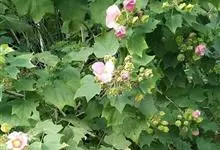 木芙蓉,锦葵科木槿属落叶灌木或小乔木。小枝上有细绒毛;叶片为卵状心形,托叶为披针形,常早落;花单生,花萼为钟形,花冠初为白色或淡红色,后逐渐变为深红色;果实为扁球形,有淡黄色的毛附着。花期8到10月。…全部>>