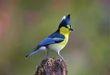 台湾黄山雀体长约13厘米。头顶至后颈黑色,有一长的黑色羽冠,羽冠末端和后颈中央白色。背苍绿色,两翅和尾黑色,羽缘蓝灰色,外侧尾羽白色。额基和下体鲜黄色,尾下覆羽白色,雄鸟腹部有一黑斑。…全部>>