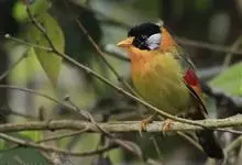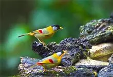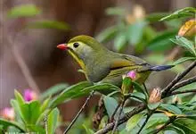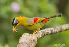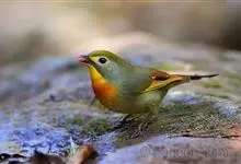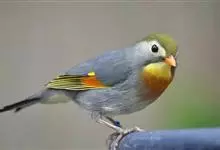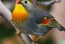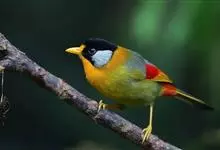 银耳相思鸟小型鸟类,体长14~18厘米。头顶黑色,耳羽银灰色,前额橙黄色;外侧飞羽橙黄色,基部朱红色,极为鲜艳、醒目。尾圆形,尾上、尾下覆羽朱红色,尾暗灰褐色,外侧尾羽橙黄色,其余上体橄榄绿或橄榄黄色。…全部>>