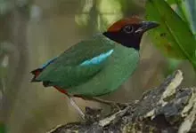 绿胸八色鸫:是雀形目八色鸫科的鸟类,共有12个亚种。体长为16-18厘米,体重65-69克。体型圆胖,尾短,腿长。头黑,上体绿色,两翼深色而具白色斑纹,头顶至后枕深褐,胸及腹部苹果绿,臀亮红。…全部>>