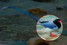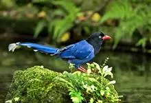 台湾蓝鹊:体长64至65厘米,翼展18至21厘米,尾长约40厘米,尾羽长占了总体长的三分之二。头、脸、颈、喉、胸都是黑色,黄色的眼珠包围黑色的瞳孔,鲜红色的鸟喙、双脚,…全部>>