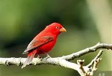 血雀雀科朱雀属鸟类,体重36-49克;体长155-182毫米。雄鸟除眼先、翼与尾为黑色外,通体为鲜红色;嘴鲜黄;雌鸟暗橄榄绿色,羽端较淡或带黄色;腰鲜黄;嘴较暗。虹膜褐色;嘴黄色;腿和脚褐色。…全部>>