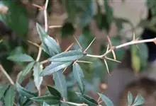 豪猪刺属于小檗科小檗属,是常绿灌木。豪猪刺的茎直立,多分枝,枝上密生小刺,叶子为三出复叶状,革质,下面有毛,花淡黄色,簇生于叶腋处,开花期在4月至6月之间,果实为椭圆形浆果,成熟时呈深紫色。…全部>>