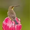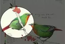 火尾太阳鸟为太阳鸟科太阳鸟属的鸟类。体长20厘米,色彩艳丽。雄鸟红色,具形长的艳猩红色中央尾羽。头顶金属蓝色,眼先和头侧黑色,喉及髭纹金属紫色。下体黄色,胸具艳丽的橘黄色块斑。雌鸟灰橄榄色,腰黄,…全部>>