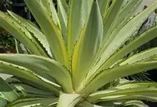 金边龙舌兰是天门冬科龙舌兰属多年生常绿草本植物。叶丛生边缘有黄白色条带镶边,有紫褐色刺状锯齿;圆锥花序黄绿色,花药丁字形着生;蒴果长椭圆形;种子扁平黑色。10年开花,结实后即枯死。…全部>>