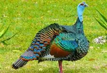 眼斑吐绶鸡:是火鸡科的两种鸟类之一。体型比普通火鸡略小些,体长1米左右,体重2.4-5.4千克,雄性比雌性略大,长得很特别,蓝色的秃脑袋上冒出几个橙黄色的疙瘩。但是它羽色艳丽,身体呈铜色及绿色。…全部>>