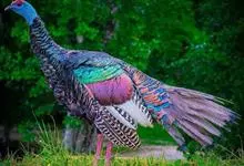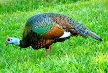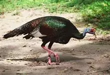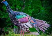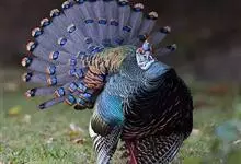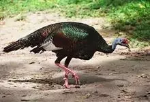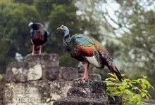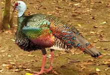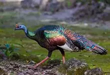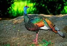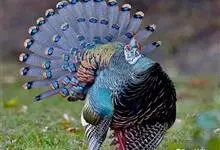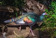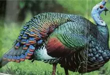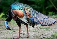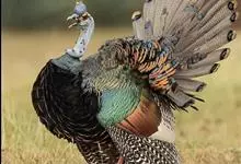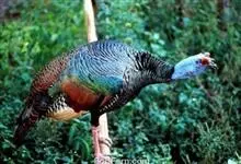 眼斑吐绶鸡:是火鸡科的两种鸟类之一。体型比普通火鸡略小些,体长1米左右,体重2.4-5.4千克,雄性比雌性略大,长得很特别,蓝色的秃脑袋上冒出几个橙黄色的疙瘩。但是它羽色艳丽,身体呈铜色及绿色。…全部>>
