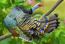 眼斑吐绶鸡:是火鸡科的两种鸟类之一。体型比普通火鸡略小些,体长1米左右,体重2.4-5.4千克,雄性比雌性略大,长得很特别,蓝色的秃脑袋上冒出几个橙黄色的疙瘩。但是它羽色艳丽,身体呈铜色及绿色。…全部>>