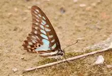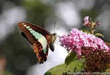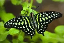 青带凤蝶Graphium sarpedon ,又名青凤蝶,是最普遍的中型凤蝶,飞行速度很快。青带凤蝶的翅膀中央有许多浅蓝色的斑点,很整齐地排列成一条直线。这些斑点由上而下逐渐变大,就像一条青色的带子。全部>>