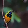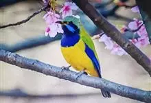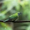 蓝翅叶鹎:小型鸟类,体长15-18厘米。雄鸟通体草绿色,尾蓝绿色,肩和翅亮蓝 色,胸缀有黄色,颏、喉黑色。雌鸟颏,喉蓝绿色。栖息在海拔1500米以下的常绿阔叶林、次生林和林缘疏林灌丛中。…全部>>