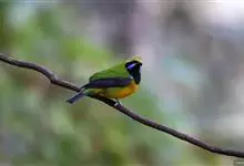 橙腹叶鹎体形大小和金额叶鹎相似,体长16~20厘米。额至后颈黄绿色,其余上体绿色,小覆羽亮钴蓝色,形成明显的肩斑。颏、喉、上胸黑色具钴蓝色髭纹,其余下体橙色。飞羽和尾羽雄鸟黑色、雌鸟绿色。…全部>>