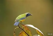 金额叶鹎是和平鸟科、叶鹎属的鸟类。体长16-20厘米。额和头顶前部金桔色,整个上体包括两翅表面草绿色。颏、喉黑色,其外围有一圈黄色,其余下体浅绿色,翼缘蓝紫色,翅上小覆羽翠蓝色。野外特征极明显,…全部>>
