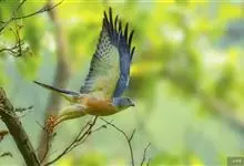 赤腹鹰:鹰科、鹰属的小型猛禽,翅膀尖而长,因外形像鸽子,所以也叫鸽子鹰。体长27-36厘米,体重108-132克。雌、雄鸟体色大致相同。翼短而尖,后缘平直,尾羽短,有数条黑色横斑。成鸟头部至背面灰黑色,…全部>>