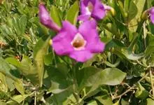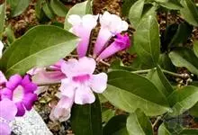 蒜香藤A.H.Gentry),又名紫铃藤、张氏紫葳,为紫葳科常绿藤状灌木。植株蔓性,具卷须,叶为二出复叶,深绿色椭圆形,具光泽。花腋生,聚伞花序,花冠筒状,开口五裂。花期春季至秋季,盛花期8-12月,…全部>>