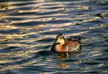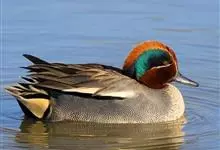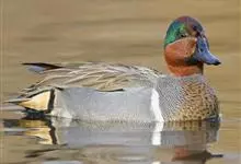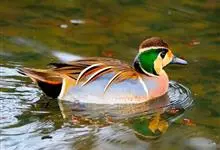 绿翅鸭是小型鸭类,体长37厘米,体重约0.5千克。嘴脚均为黑色。雄鸟头至颈部深栗色,头顶两侧从眼开始有一条宽阔的绿色带斑一直延伸至颈侧,尾下覆羽黑色,两侧各有一黄色三角形斑,在水中游泳时,极为醒目。…全部>>
