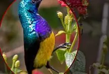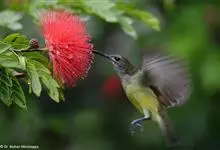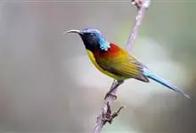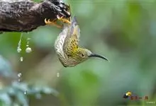 绿喉太阳鸟:共有9个亚种。小型鸟类,雄鸟体长13-15厘米、雌鸟10-12厘米。雄鸟前额至后颈、颏和喉辉绿色,头侧黑色,颈侧和背暗红色,两肩、下背橄榄绿色,腰鲜黄色,尾上覆羽和中央尾羽暗绿色,…全部>>