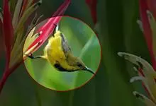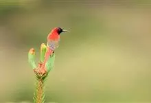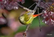 火尾太阳鸟为太阳鸟科太阳鸟属的鸟类。体长20厘米,色彩艳丽。雄鸟红色,具形长的艳猩红色中央尾羽。头顶金属蓝色,眼先和头侧黑色,喉及髭纹金属紫色。下体黄色,胸具艳丽的橘黄色块斑。雌鸟灰橄榄色,腰黄,…全部>>