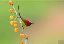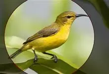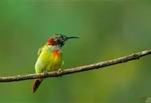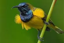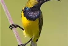 黄腹花蜜鸟是雀形目太阳鸟科花蜜鸟属鸟类。体型较小、喙略短而弯、腹部黄色。雄鸟繁殖季节颏及胸黑紫色并泛金属光泽,具有绯红色及灰色胸带,将上腹部黑色斑与前胸隔开,肩斑为橙黄色丝质羽,上体橄榄绿色,…全部>>