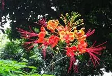 洋金凤 Sw.),豆科小凤花属灌木状或小乔木植物,枝无毛,绿或粉绿色;二回羽状复叶;总状花序伞房状,萼片无毛,花瓣橙红或黄色,圆形,花丝红色,子房无毛,花柱橙黄色;荚果窄而薄,…全部>>
