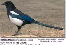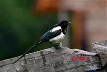喜鹊:是鸦科、鹊属的一种鸟类。共有11个亚种。体长40-50厘米,雌雄羽色相似,头、颈、背至尾均为黑色,并自前往后分别呈现紫色、绿蓝色、绿色等光泽,双翅黑色而在翼肩有一大形白斑,尾远较翅长,呈楔形,…全部>>