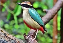 绿胸八色鸫:是雀形目八色鸫科的鸟类,共有12个亚种。体长为16-18厘米,体重65-69克。体型圆胖,尾短,腿长。头黑,上体绿色,两翼深色而具白色斑纹,头顶至后枕深褐,胸及腹部苹果绿,臀亮红。…全部>>
