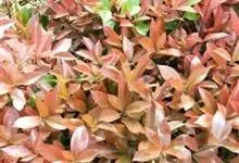 红叶石楠 是蔷薇科,石楠属杂交种,为常绿小乔木或灌木,乔木高可达5米、灌木高可达2米。叶片革质,长圆形至倒卵状、披针形,叶端渐尖,叶基楔形,叶缘有带腺的锯齿,花多而密,复伞房花序,花白色,梨果黄红色,…全部>>