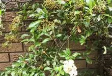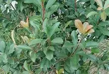 石楠 Kalkman),是蔷薇科石楠属的常绿乔木,高5~12米,株型紧凑,树冠圆球形。树枝为褐灰色;鳞片为褐色,没有毛;叶片革质,长椭圆至侧卵状椭圆形,有锯齿,新叶红色光亮。复伞房花序,白色小花,…全部>>