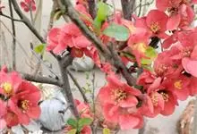 贴梗海棠Nakai)是蔷薇科、木瓜海棠属植物。落叶灌木,高达2米,枝条直立开展,有刺。叶片卵形至椭圆形,稀长椭圆形,长3-9厘米,宽1.5-5厘米。花先叶开放,3-5朵簇生于二年生老枝上。…全部>>