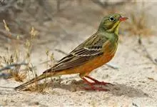 圃鹀:体重20-25克,体长150-175毫米,属小型鸣禽。喙为圆锥形,与雀科的鸟类相比较为细弱,上下喙边缘不紧密切合而微向内弯,因而切合线中略有缝隙;体羽似麻雀,头上、后颈及胸橄榄绿色,翕呈栗褐色…全部>>