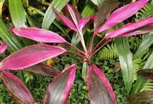朱蕉 A. Chev.)是天门冬科朱蕉属的直立灌木。茎有时稍分枝;叶长圆形或长圆状披针形,绿或带紫红色,叶柄有槽,基部宽,抱茎;花序侧枝基部有大苞片,花淡红、青紫或黄色,花梗常很短,…全部>>