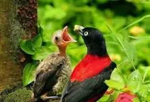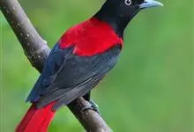 朱鹂:中等鸟类,体长23-28厘米。雄鸟绛紫红色,头、上胸及翼黑色。雌鸟上背及背部深灰色,尾覆羽及尾绛紫红色,腹部及下胸白而密布黑色纵纹。与鹊色鹂幼鸟的区别在上背灰色较深,下体白色较少且纵纹较粗。…全部>>