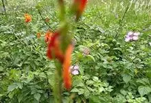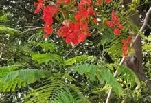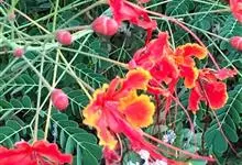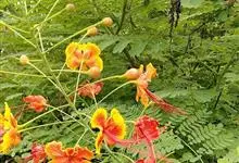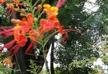 洋金凤 Sw.),豆科小凤花属灌木状或小乔木植物,枝无毛,绿或粉绿色;二回羽状复叶;总状花序伞房状,萼片无毛,花瓣橙红或黄色,圆形,花丝红色,子房无毛,花柱橙黄色;荚果窄而薄,…全部>>
