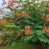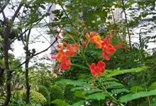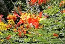洋金凤 Sw.),豆科小凤花属灌木状或小乔木植物,枝无毛,绿或粉绿色;二回羽状复叶;总状花序伞房状,萼片无毛,花瓣橙红或黄色,圆形,花丝红色,子房无毛,花柱橙黄色;荚果窄而薄,…全部>>