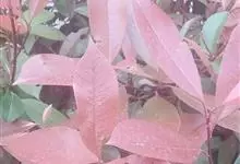 红叶石楠 是蔷薇科,石楠属杂交种,为常绿小乔木或灌木,乔木高可达5米、灌木高可达2米。叶片革质,长圆形至倒卵状、披针形,叶端渐尖,叶基楔形,叶缘有带腺的锯齿,花多而密,复伞房花序,花白色,梨果黄红色,…全部>>