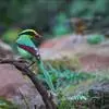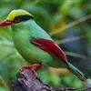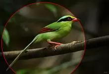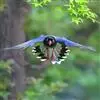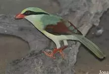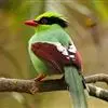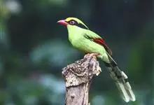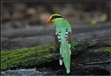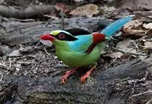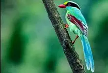 蓝绿鹊:中型鸟类,共有5个亚种。体长36-38厘米。尾长,嘴、脚红色。通体羽色主要为草绿色,宽阔的黑色贯眼纹向后延伸到后颈,在绿色的头侧极为醒目。两翅栗红色,内侧飞羽具黑色次端斑和白色尖端。尾绿色,…全部>>